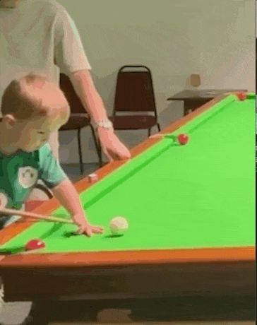 两岁半的时候,他完成了第一次击球,从此开始经常练习打球,虽然暂时还不能把斯诺克玩得很溜,但花式台球已经玩出了一些心得。
