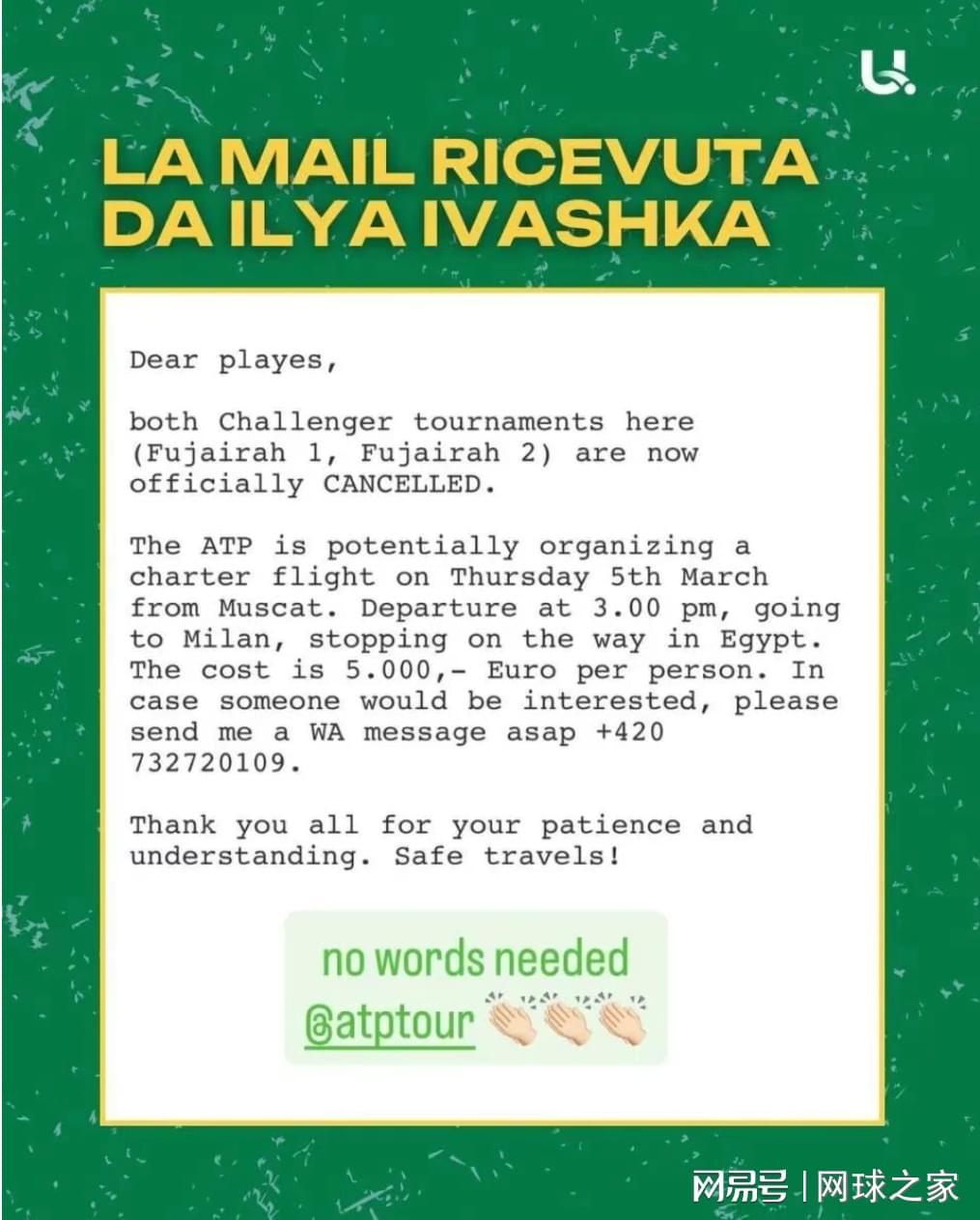 就在所有人都在期待ATP的表态,以及这件事的最终走向时,球员伊利亚·伊瓦什卡通过个人社交媒体第一时间对外透露,所有球员的抗争和外界为滞留球员的发声赢得了全面胜利,撤离中东包机费用事件画上了句号,结果让所有人都很满意。
