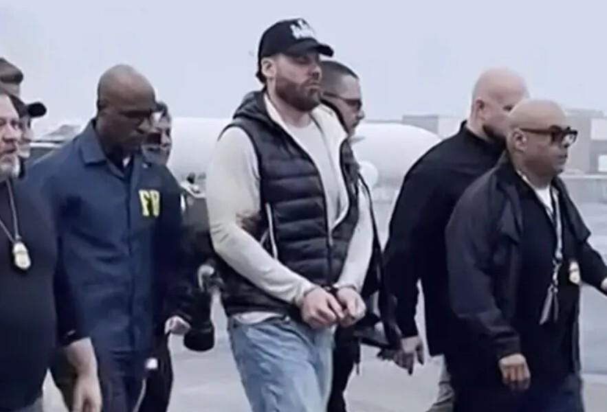 随后美国媒体发布了韦丁被抓到美国之后的视频,画面中44岁的韦丁被一群联邦特工环绕,身穿黑色羽绒背心、灰色汗衫和牛仔裤,头戴黑色棒球帽,双手铐在身前,在加州安大略国际机场走下飞机。